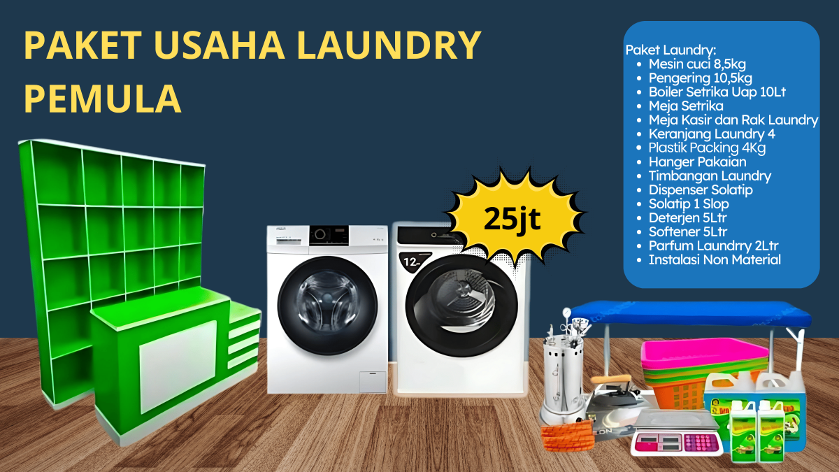 Jual paket laundry untuk pemula, dengan harga Rp 25.000.000 (dp: Rp 1.000.000) satu paket terdiri atas 15 barang: